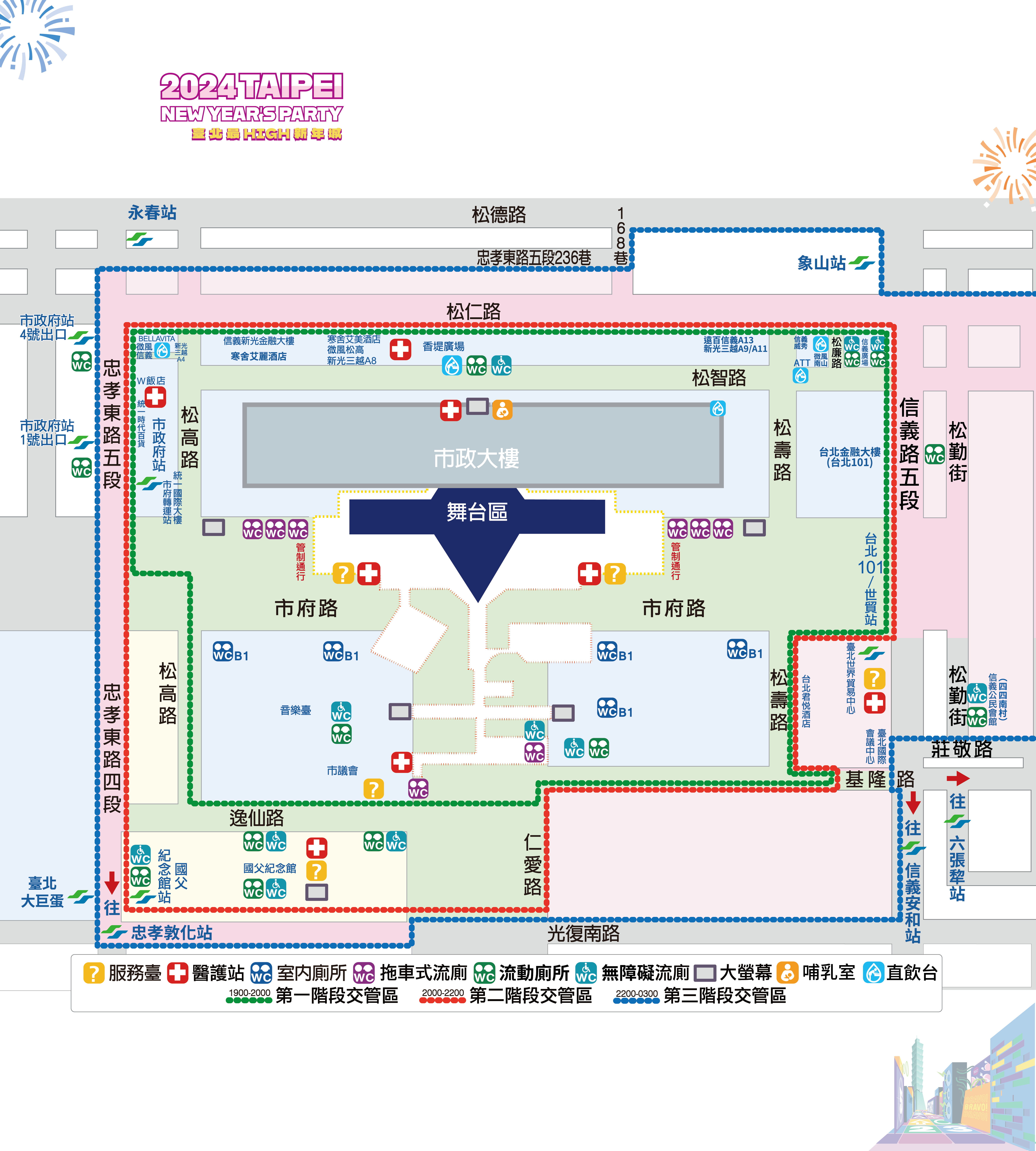 哺乳室:於臺北市政府東門廣場,若欲使用請至服務臺洽詢。